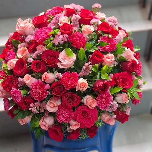 Lush, overflowing, and absolutely stunning! This gorgeous basket explodes with a rich tapestry of red and pink roses,carnations and florals. It’s the perfect way to send a massive dose of color and happiness. Order today for guaranteed smiles!