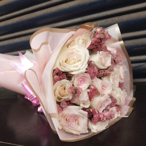 This luxurious bouquet showcases the exceptional beauty of creamy white and soft blush 'Emma Roses,' known for their gentle coloring and elegant form. These exquisite blooms are beautifully contrasted by lush clusters of vibrant pink accent flowers nestled throughout the arrangement, adding romantic texture. The entire composition is expertly wrapped in layers of soft blush paper with a stylish metallic gold trim, highlighting its sophisticated appeal. This dreamy arrangement is the perfect gesture for conveying sincere admiration and delicate affection.
