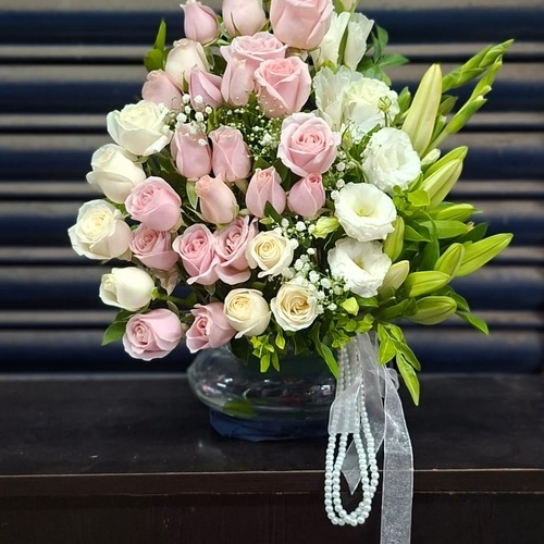 This simple yet stunning arrangement celebrates the delicate charm of sweet peach and creamy white blooms, making it a perfect gift for any occasion. It features soft peach roses and classic white accent flowers, meticulously arranged to create a lush, rounded composition. The beautiful flowers are showcased in a clear glass vase, allowing the stems and water to add to the clean, natural elegance of the design. This charming and thoughtful gift beautifully conveys sincerity, admiration, and heartfelt joy.